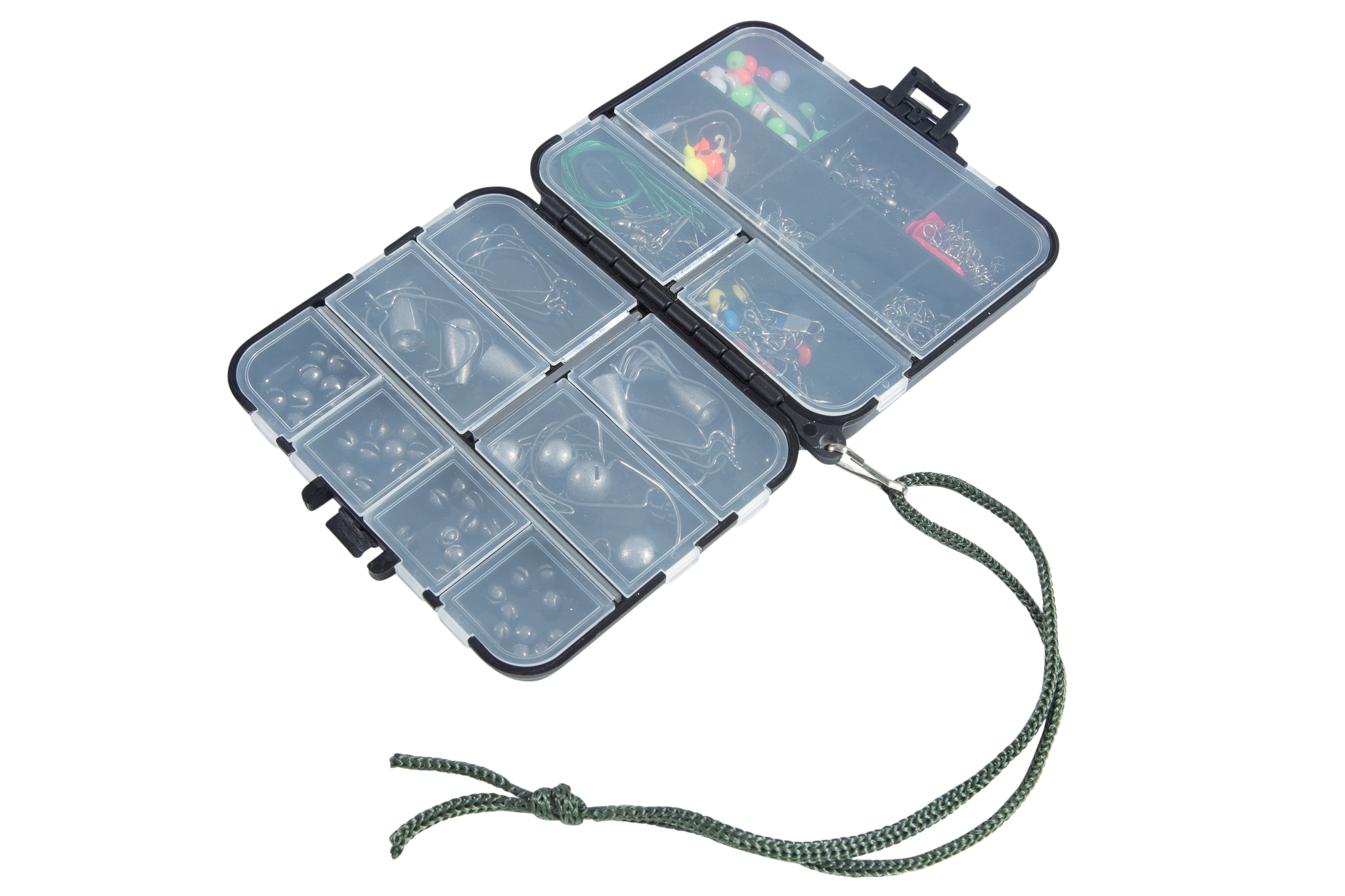 Denne Tackle Box er fyldt med småt udstyr til rovfiskeri. Svirvler, hægter, springringe, perler, kroge, stoppere, forfang, lodder, trekroge og jig-hoveder i alle former og størrelser – uundværlig til at lave rigs og montere agn, uanset hvilken teknik du fisker med. De 257 dele er praktisk sorteret i en solid sortimentsæske og tilbydes nu til en meget konkurrencedygtig pris.